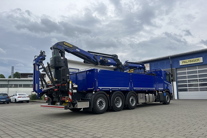 Volvo FH 8x2 Tridem mit Palfinger PK 34002 SH und PJ060B. Extra große Ladebrücke mit 7m Innenlänge. Abnehmbare Wendegabelhalterung und offene Wanne für sperrige Gegenstände am Heck.