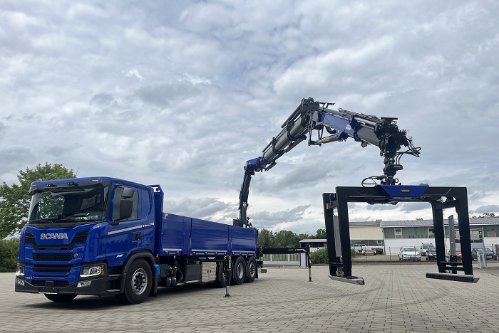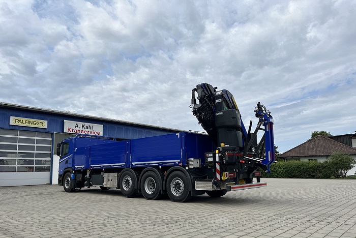 Scania G460 8x2 Tridem mit Palfinger PK 370 TEC und PJ090B. Extra große Ladebrücke mit 7,25m Innenlänge. Abnehmbare Wendegabelhalterung und offene Wanne für sperrige Gegenstände am Heck. Doppelt geteilte Bordwände mit verbreiteter Mittelrunge, um Bordwände auch bei ausgefahrenen Zusatzstützen abklappen zu können.