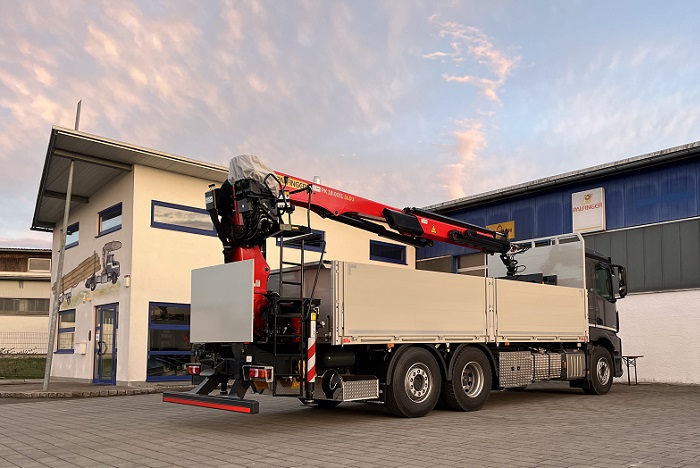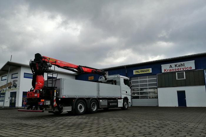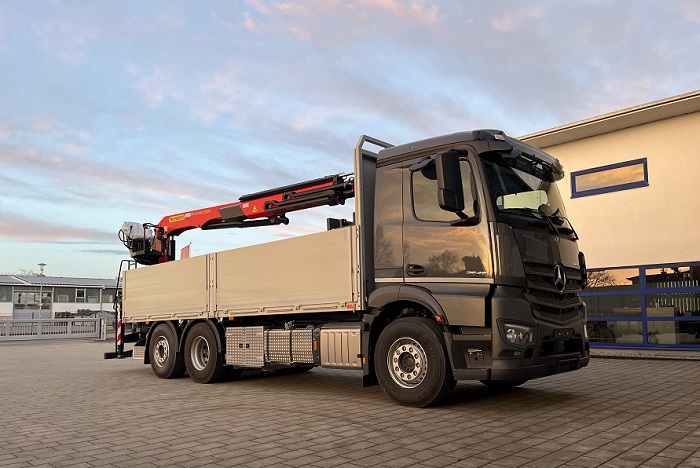 Mercedes 6x2 mit Palfinger Langarmkran PK 18.001L SLD3 und Steinstapelzange. Ladebrücke mit Bordwandhebehilfe und Aufstiegstritten in jedem Laden.