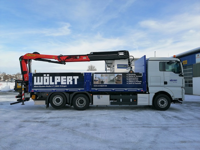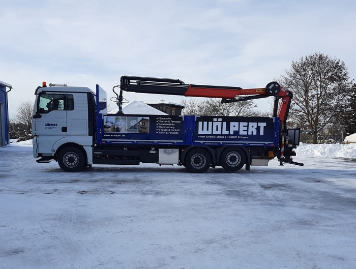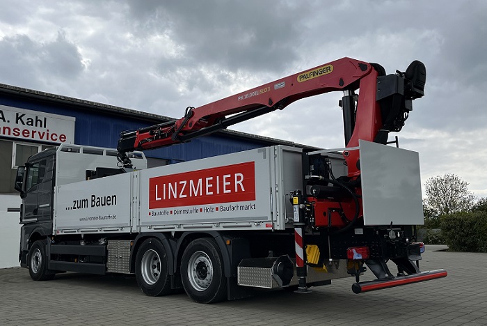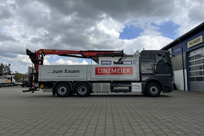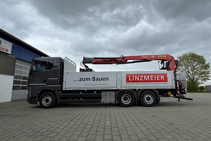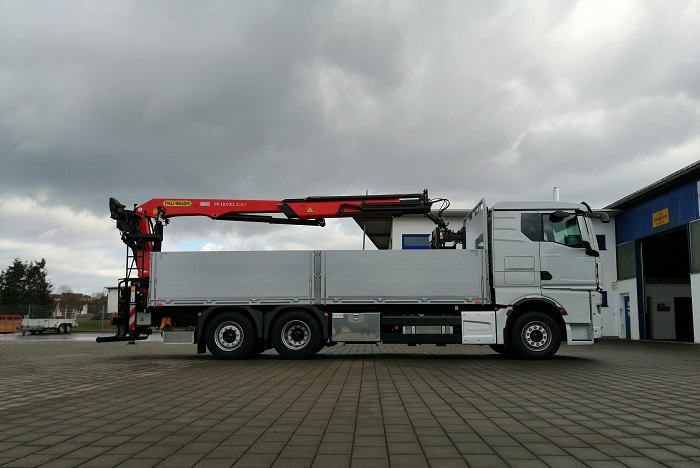 MAN TGX 6x2 mit Palfinger Langarmkran PK 18.001L SLD3 und Steinstapelzange. Ladebrücke mit Bordwandhebehilfe und Aufstiegstritten in jedem Laden.
