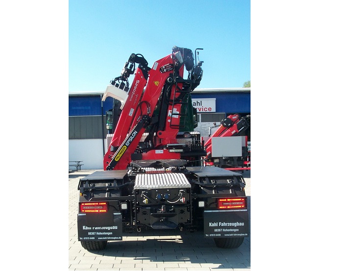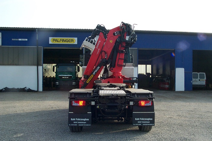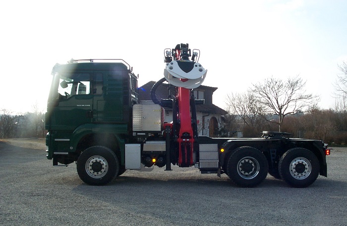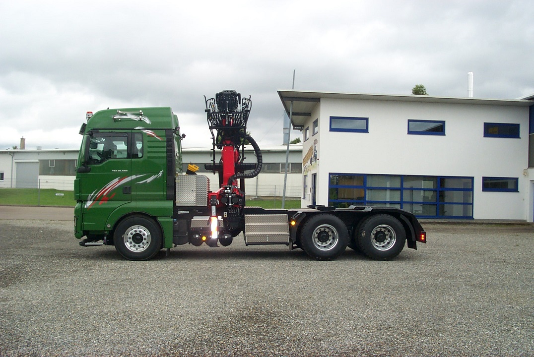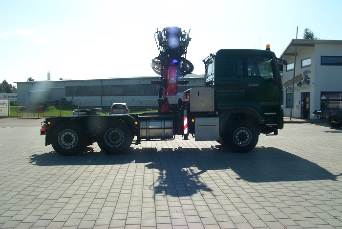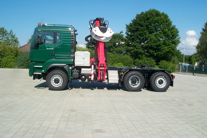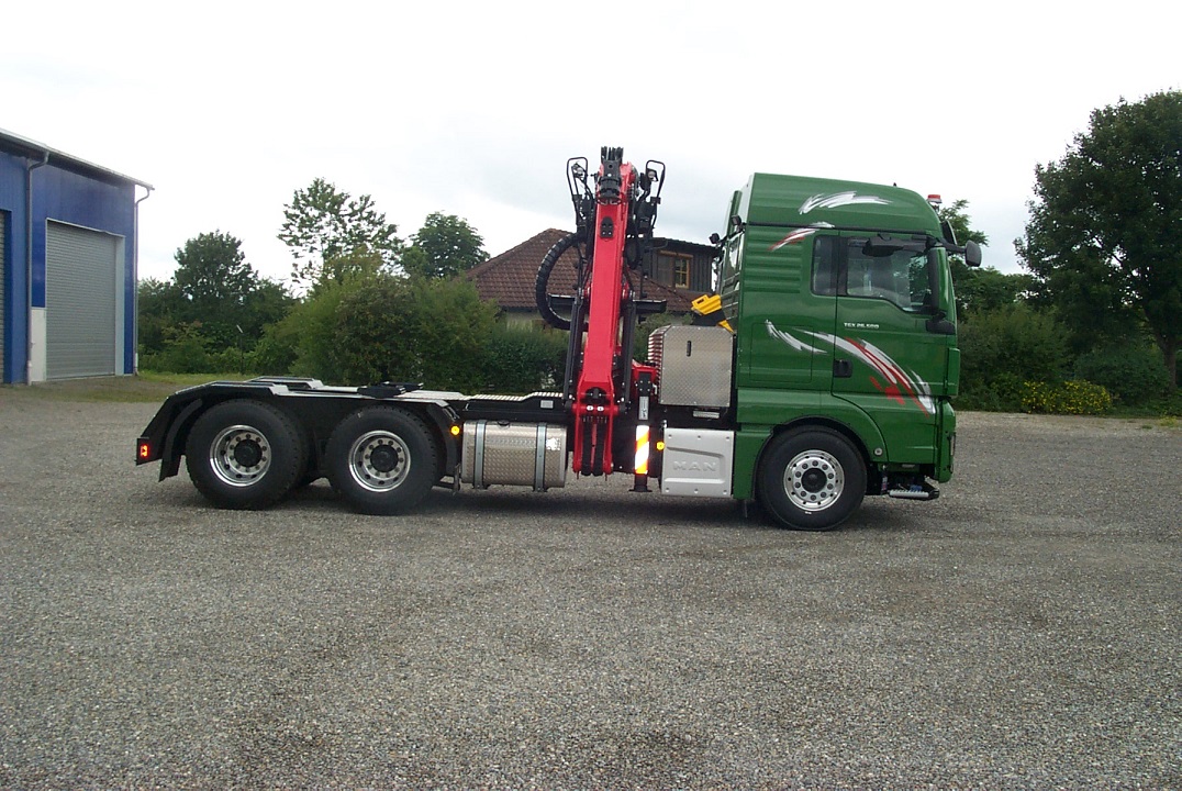 MAN TGS 6x4 Langholzsattelaufbau mit Epsilon Kran S260Z.