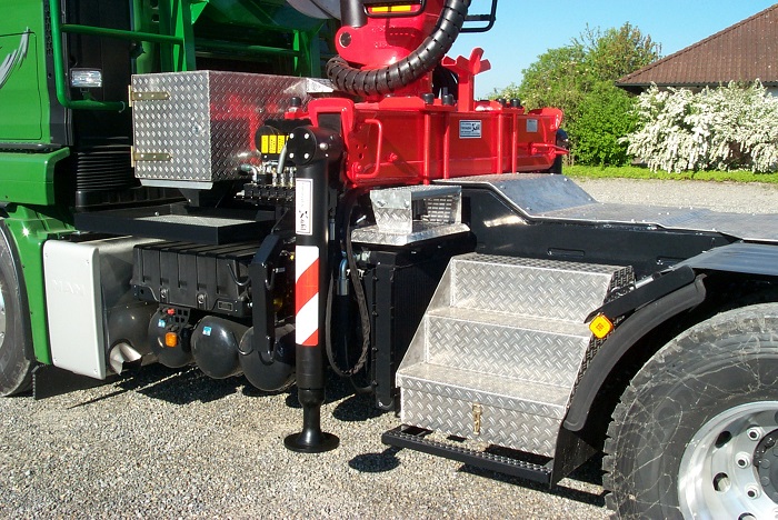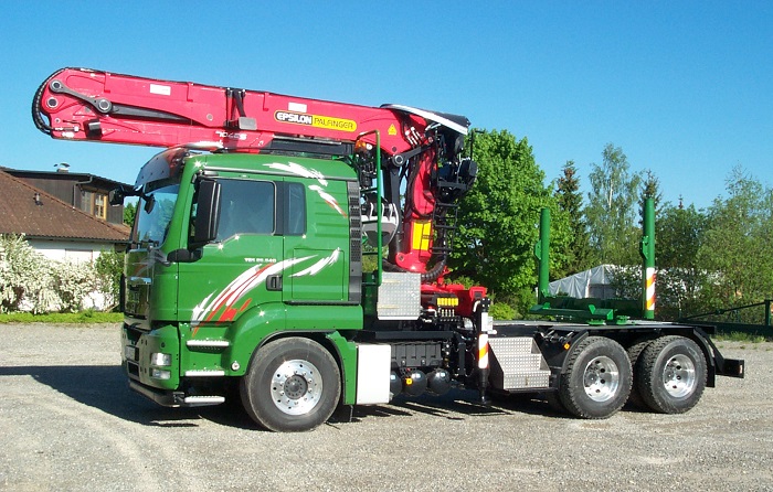 MAN 6x4 Langholzaufbau mit Epsilon Kran S290Z HPLS. Aufbau als Kombi System mit Lenkzylinder im Hilfsrahmen.