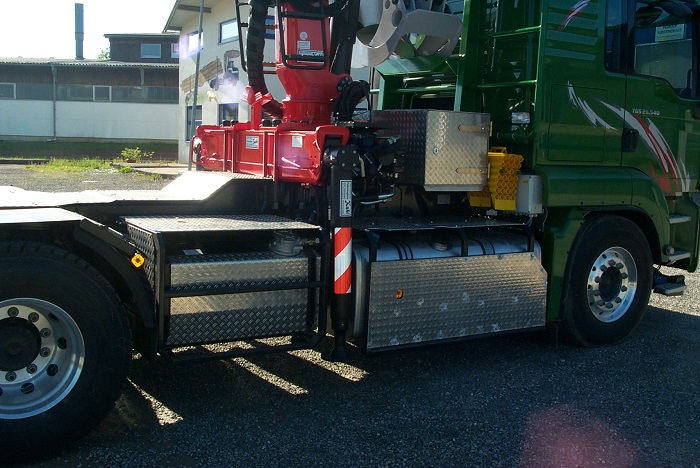 Langholzaufbau mit Huttner Schemel und Epsilon Kran S270L auf MAN 6x4
