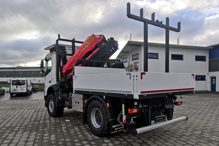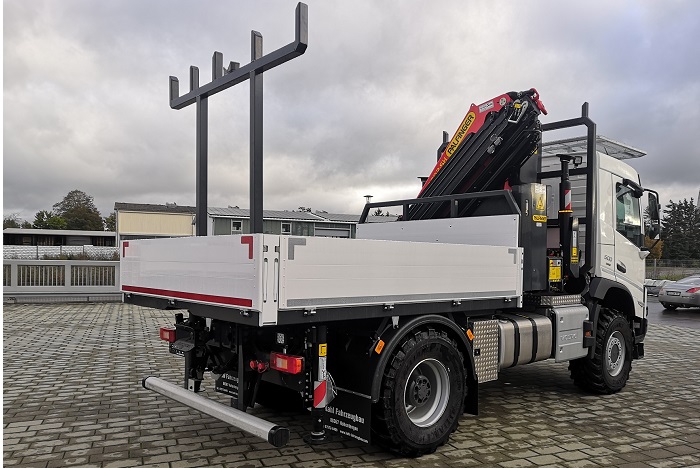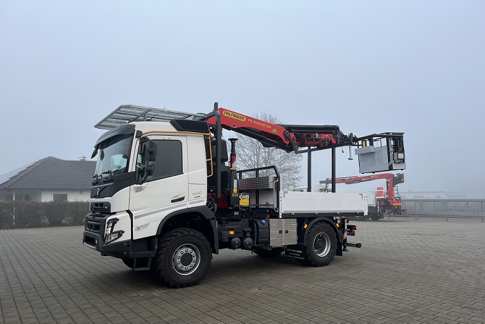 Volvo FM 4x4 blattgefedert mit spezieller Geländebereifung. Palfingerkran PK 23002 SH mit Hubarbeitskorb BB040 verbaut. Verzinkter Fahrerhausschutz zum Schutz vor herabfallenden Gegenständen. Abnehmbares Tragegestell zum Transport von überlangen Holzmasten im Gelände.