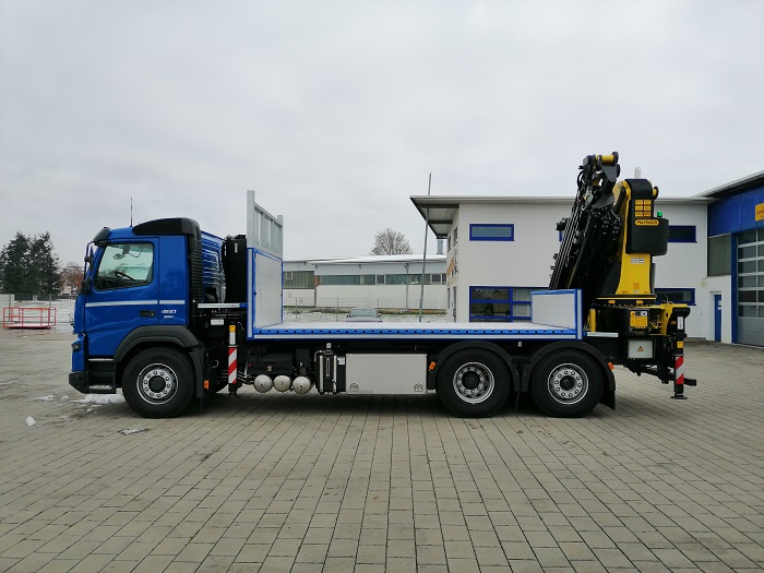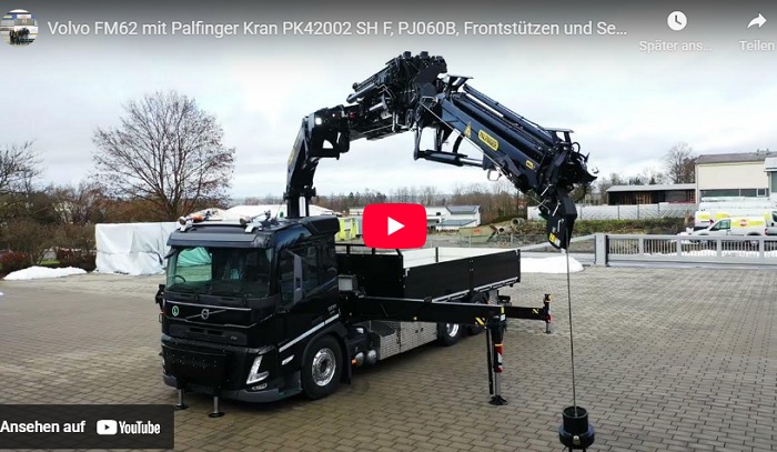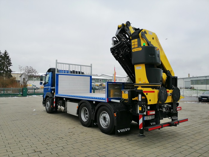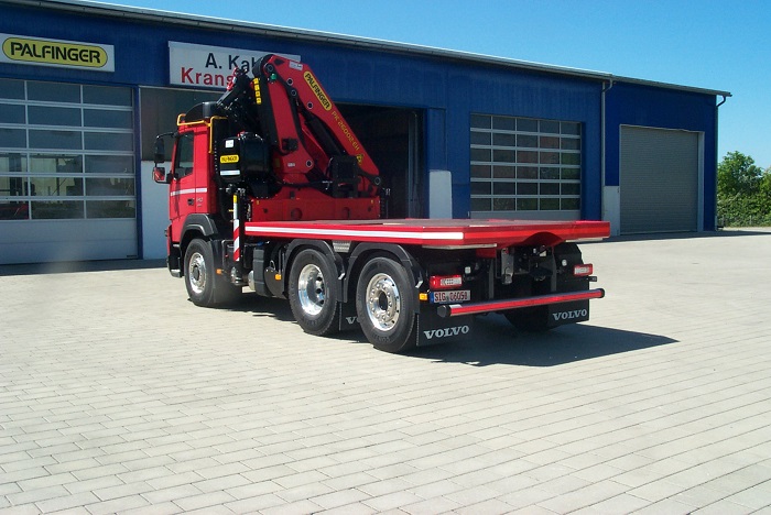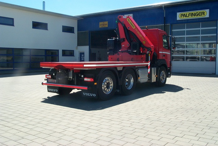 Volvo FM 6x2 mit Palfinger PK 42002 SH und PJ060B. Doppelte Frontstütze für einen uneingeschränkten Arbeitsbereich. Spezielle Tiefbaubrücke mit 5 im Boden eingelassenen Zurrschienen.