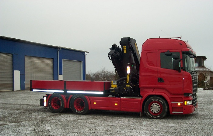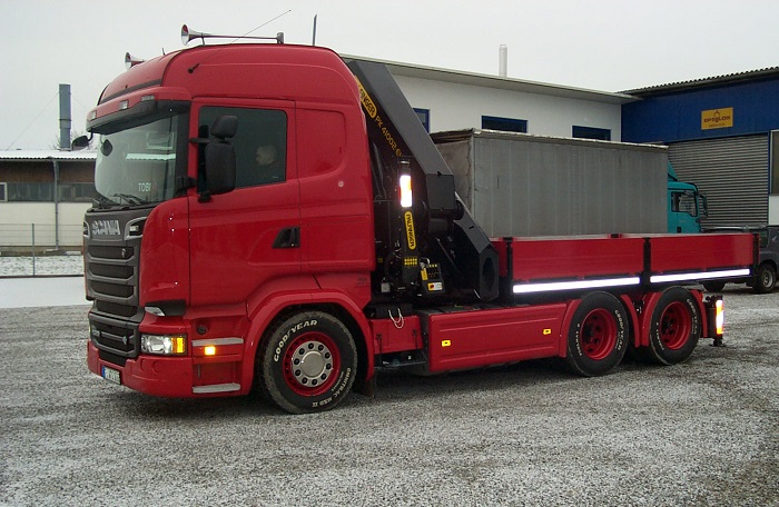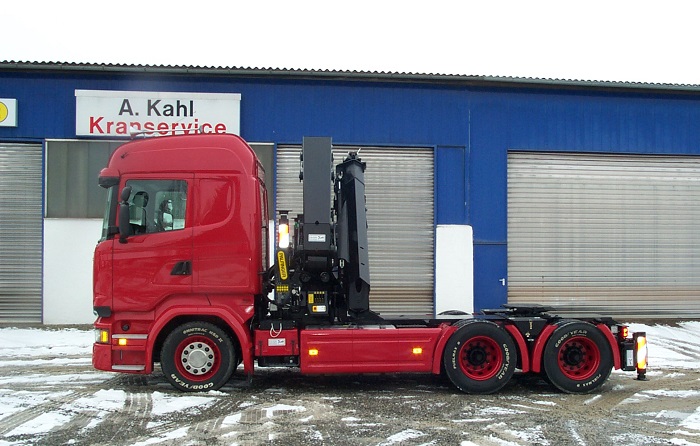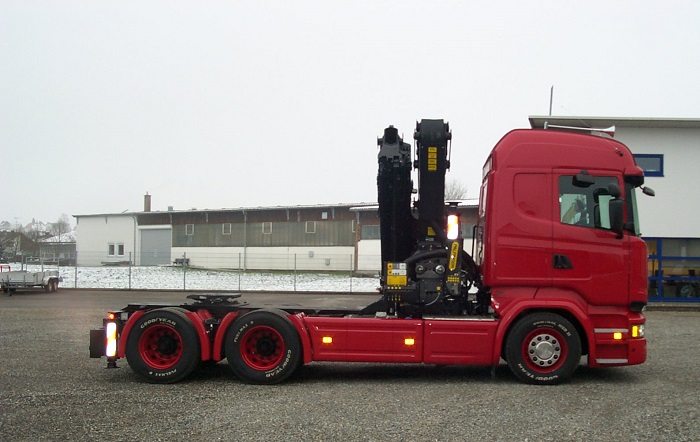 Scania R520 6x4 mit Palfinger Kran PK41.002 EH 14 Meter Reichweite mit Zusatzabstützung am LKW Heck. Spezialaufbau mit Sonderkonstruktion als Sattelfahrzeug und im Wechsel mit Pritschenfahrzeug. Sattelkupplung kann über 4 Spezial Konuse in der Sattelplatte abmontiert werden. Die Ladebrücke wird über 4 Schnellverschlüsse montiert und über 4 Bolzen abgesichert.
