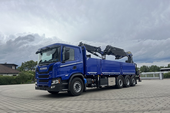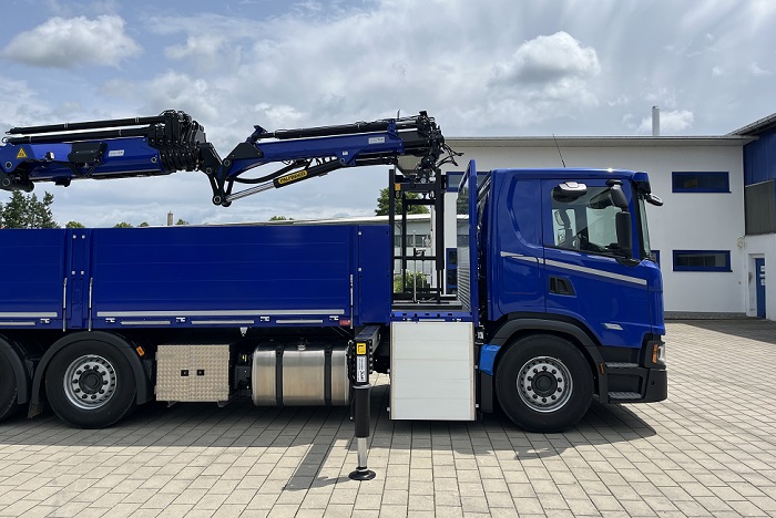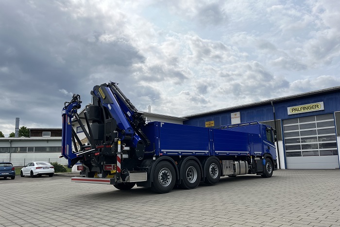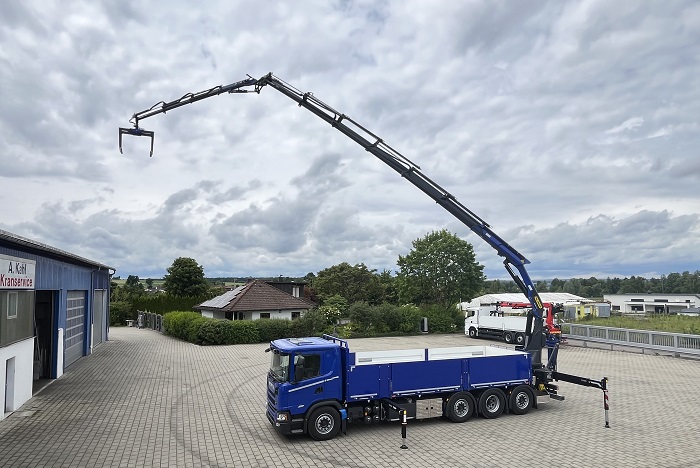 Scania G460 8x2 Tridem mit Palfinger PK 370 TEC und PJ090B. Extra große Ladebrücke mit 7,25m Innenlänge. Abnehmbare Wendegabelhalterung und offene Wanne für sperrige Gegenstände am Heck. Doppelt geteilte Bordwände mit verbreiteter Mittelrunge, um Bordwände auch bei ausgefahrenen Zusatzstützen abklappen zu können.