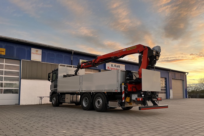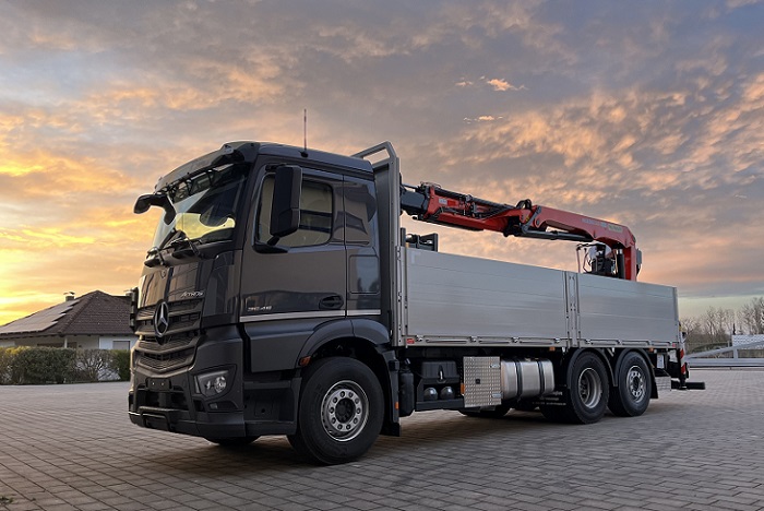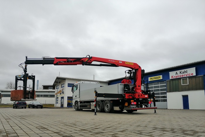 Mercedes 6x2 mit Palfinger Langarmkran PK 18.001L SLD3 und Steinstapelzange. Ladebrücke mit Bordwandhebehilfe und Aufstiegstritten in jedem Laden.