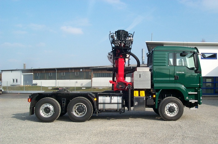 MAN TGS 6x4 Langholzsattelaufbau mit Epsilon Kran S260Z.