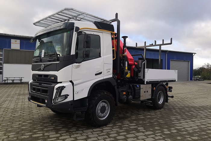 Volvo FM 4x4 blattgefedert mit spezieller Geländebereifung. Palfingerkran PK 23002 SH mit Hubarbeitskorb BB040 verbaut. Verzinkter Fahrerhausschutz zum Schutz vor herabfallenden Gegenständen. Abnehmbares Tragegestell zum Transport von überlangen Holzmasten im Gelände.