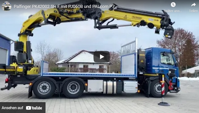 Volvo FM 6x2 mit Palfinger PK 42002 SH und PJ060B. Doppelte Frontstütze für einen uneingeschränkten Arbeitsbereich. Spezielle Tiefbaubrücke mit 5 im Boden eingelassenen Zurrschienen.